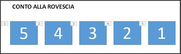 Iniziare creando cinque caselle di testo con i numeri da 5 a 1. Viene aggiunta un'animazione in modo che gli elementi scompaiano uno alla volta, a intervalli di un secondo.
