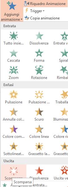 Nel gruppo Animazione avanzata della scheda Animazioni fare clic su Aggiungi animazione e andare in basso fino a Esci. Da qui è possibile selezionare l'animazione desiderata, ad esempio Scomparsa .