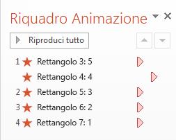 Fare clic su> riquadro Animazione per visualizzare il riquadro Animazione. La numerazione dei rettangoli può risultare complessa perché PowerPoint conta anche gli altri oggetti della diapositiva. Osservare il numero a destra, che visualizza il testo nel rettangolo.