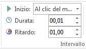 Selezionare Rettangolo 5 e, nel gruppo Animazioni> Intervallo, lasciare l'impostazione Inizio: Al clic del mouse e durata: 0,01, ma impostare Ritardo su 01,00, un secondo.