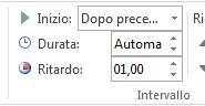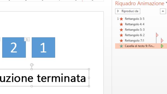 Dopo il conto alla rovescia, è consigliabile aggiungere un'animazione, ad esempio una casella di testo con l'etichetta Fine. A questo scopo, inserire la casella di testo, selezionarla, passare ad Animazioni > animazione > visualizzazione > entrata. Quindi, nel gruppo Intervallo impostare Inizio su Dopo precedente, impostare Durata su Automatica e Impostare ritardo su 00,00. Si noti che questa casella di testo viene visualizzata anche nel riquadro Animazione.