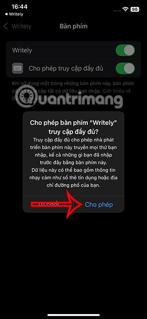 In questa nuova interfaccia è necessario abilitare Writely , quindi abilitare Consenti accesso completo . Tocca Consenti per abilitare l'app tastiera.