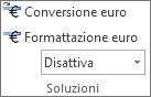 Scheda formule . Dopo l'installazione e l'attivazione degli strumenti di valuta euro, nel gruppo soluzioni vengono visualizzati i comandi di conversione euro e formattazione euro .